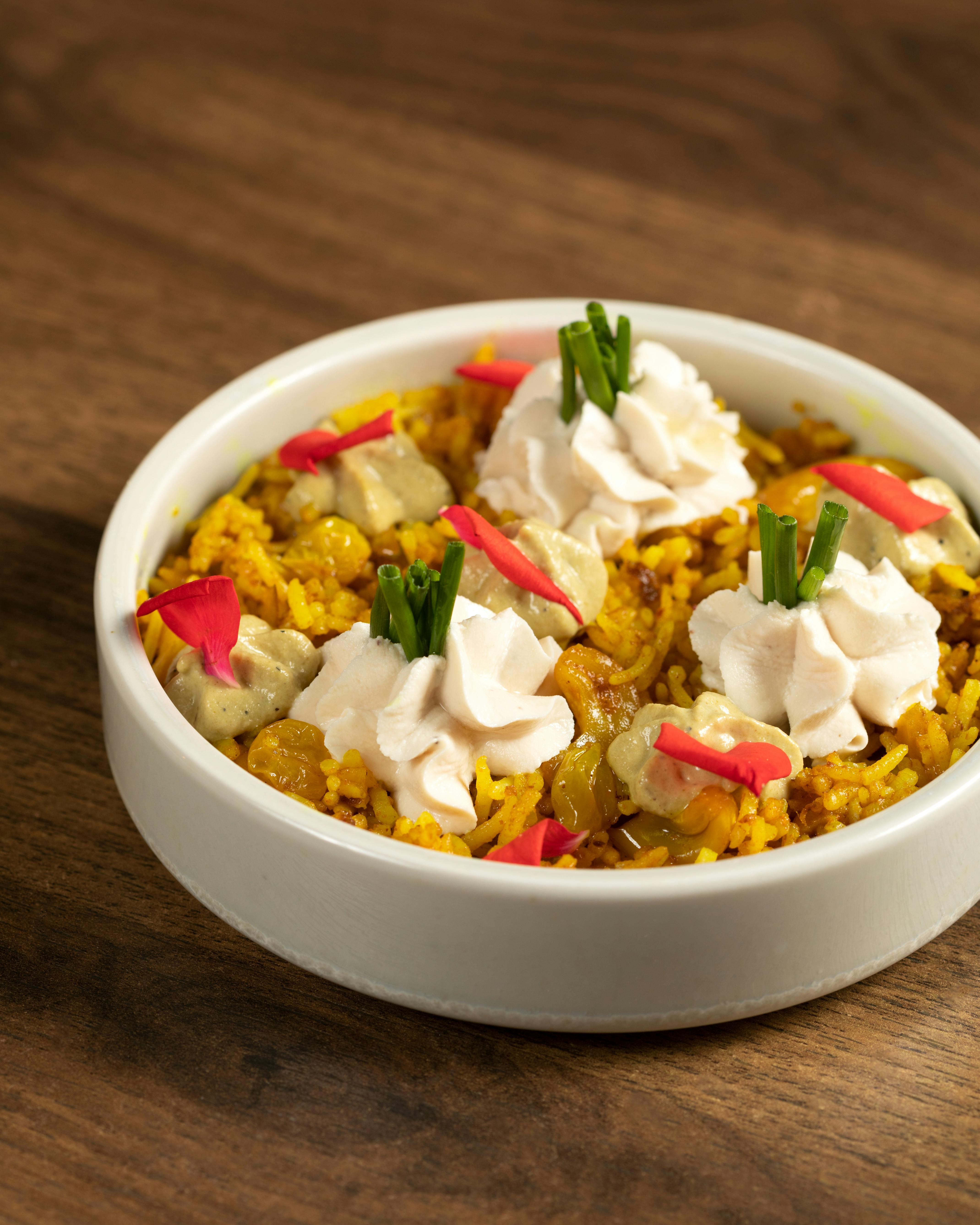 Called the Starry Night, this dish is a simple biriyani with cashews and two different sauces; smoked poblano paste/crema and topped with lavender oil tableside.