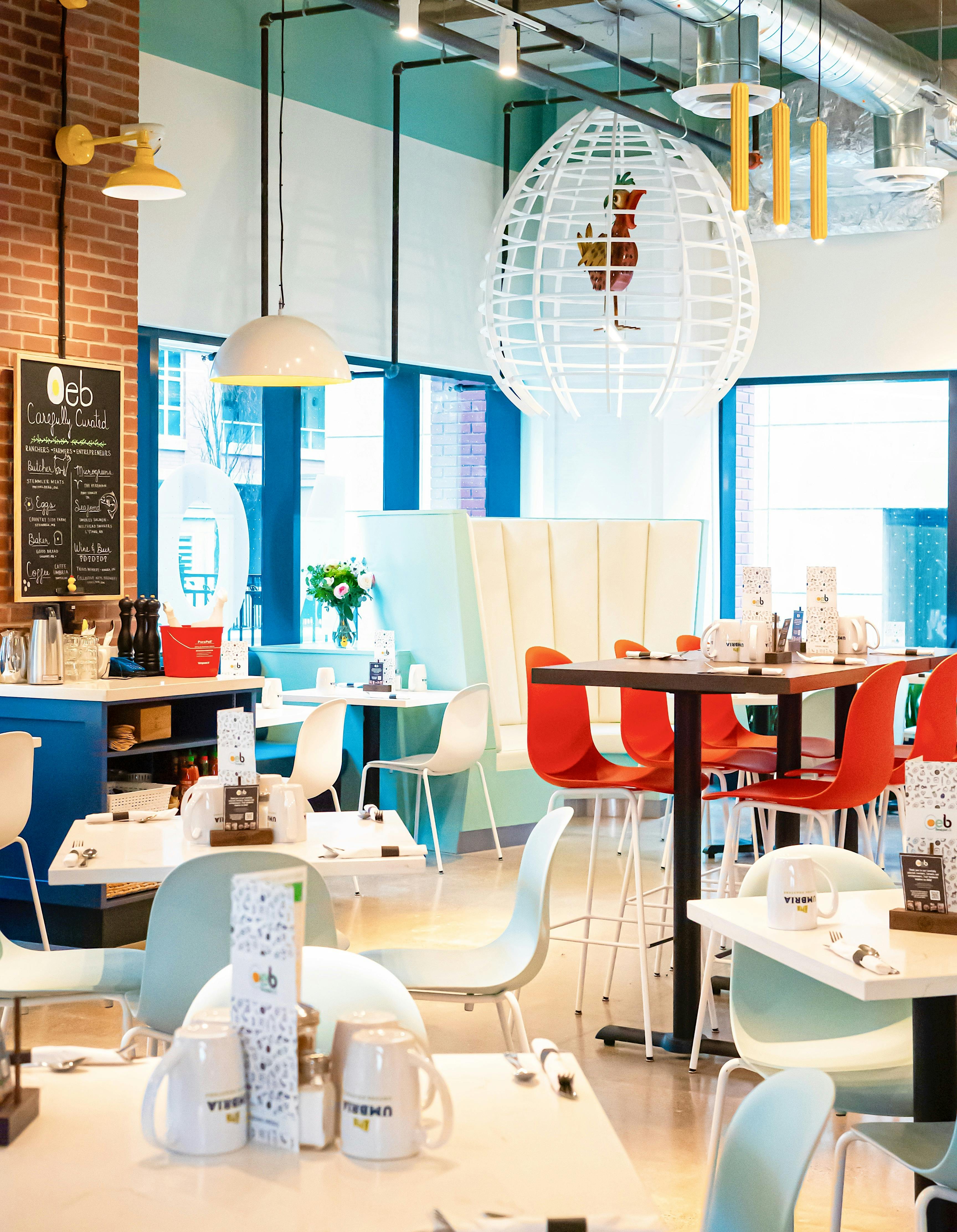 If there was ever any doubt about what OEB's menu offers, a first glance at the space makes it abundantly clear. Predominantly white, it features pops of colour from furniture and egg-themed décor throughout. From a statement wall displaying cracked eggs holding the chain's initials to egg-like lamp fixtures that bathe guests in yolk-coloured light, there's no mistaking OEB's reason for being.