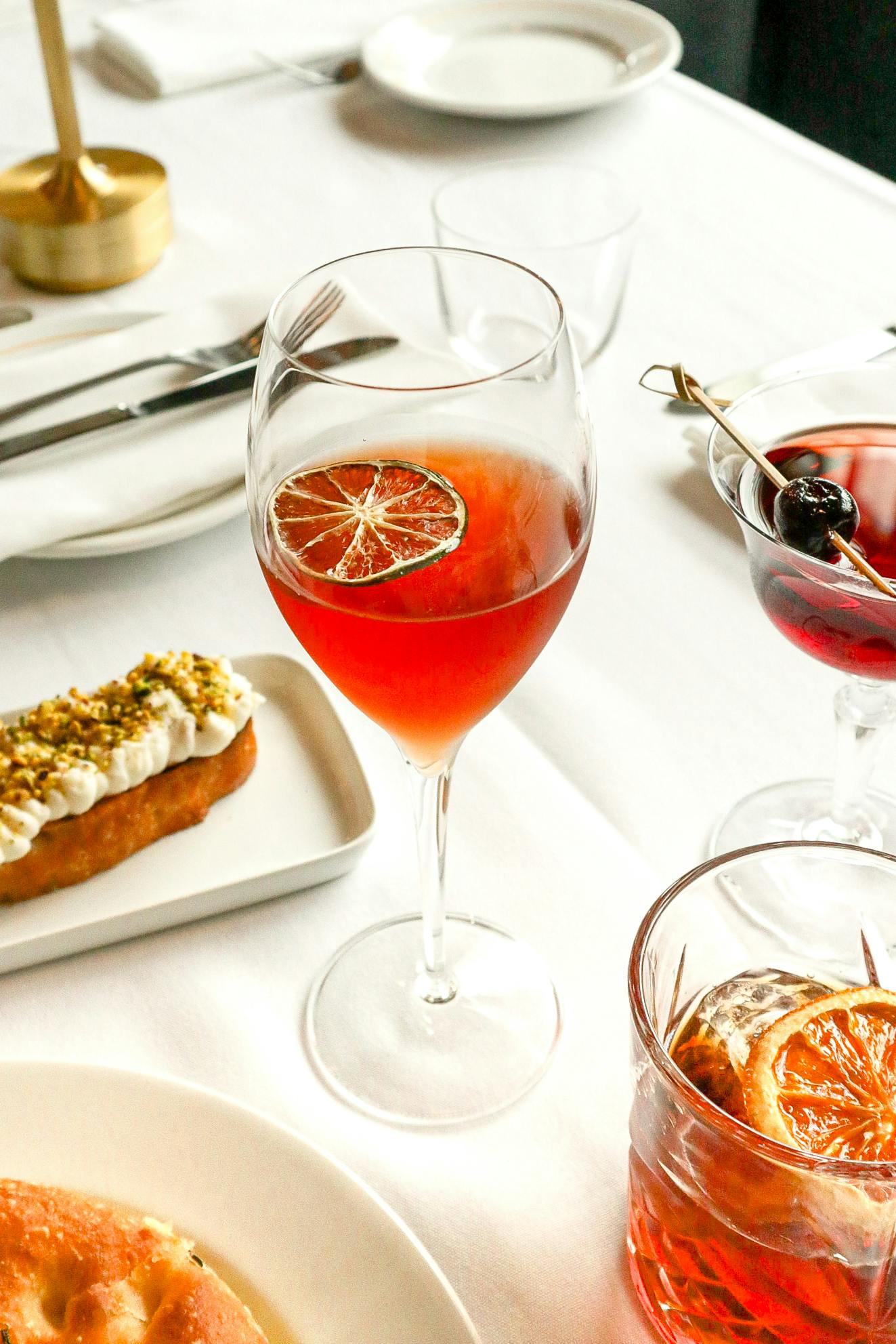 From there, there are myriad ways to fill the table. Begin with rich, crackly arancini; shrimp cocktail livened up with pungent puttanesca; and radicchio Caesar that’s, according to Rindinella, “heavy on the anchovy and the lemon.” Alternatively, you might prefer zippy green salad gilded with lashings of Pecorino Romano; chicken liver mousse balanced by frutta cotta, chives and toast; or ricotta crostone, a hulking slice of focaccia topped with a debaucherous dollop of whipped ricotta, truffled honey and a crunchy sprinkling of pistachios.