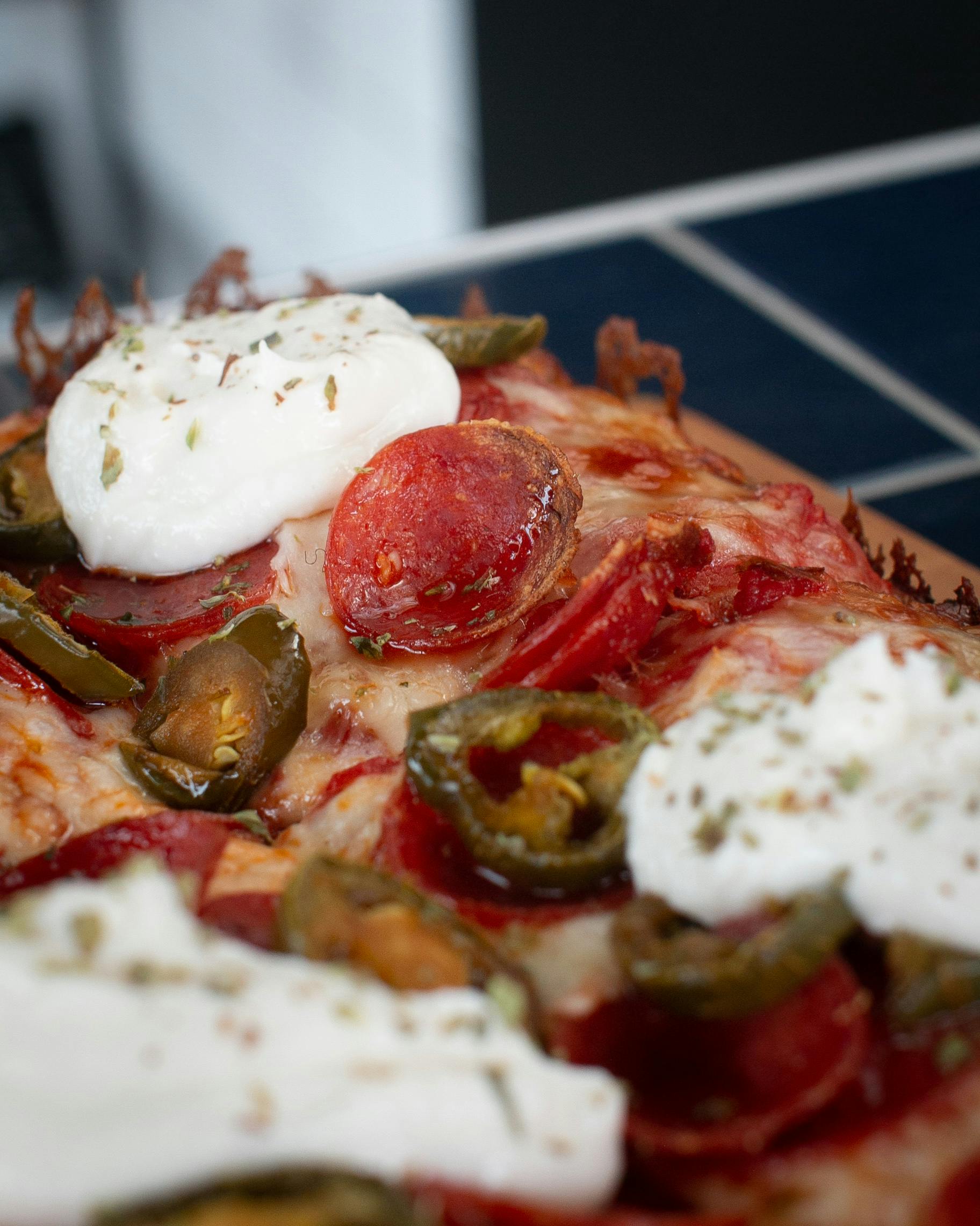 After the final bake, the pizzas are sliced into four squares and dolloped and drizzled, spiced and sprinkled with an array of seasonings and condiments. These range from herb-infused extra virgin olive oil and grated pecorino to fresh basil, parsley and Sicilian oregano. A lot of time was spent tracking down Mike’s Hot Honey Drizzle, an extra special made-in-Brooklyn sauce that packs some seriously sweet heat.