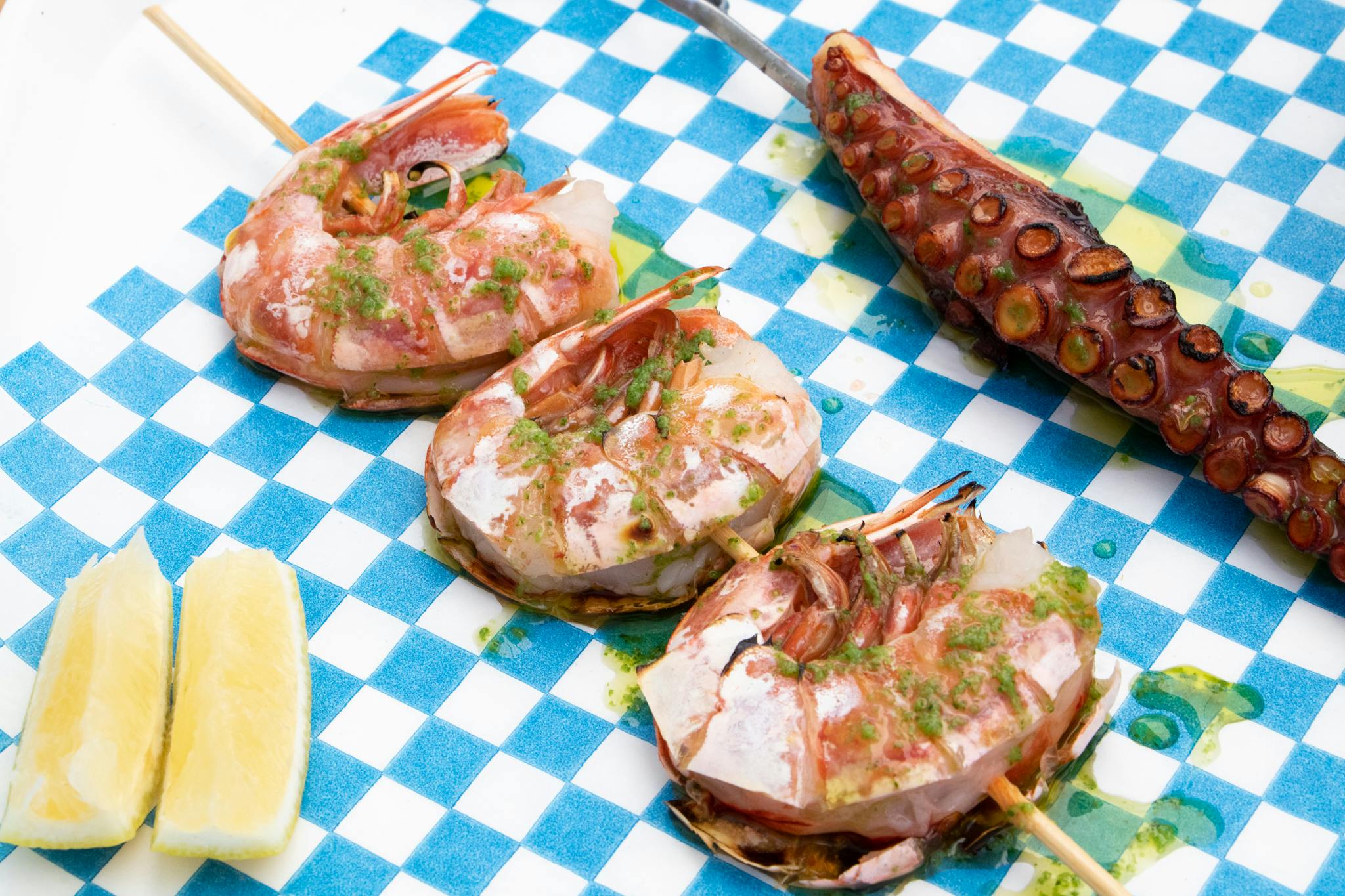 Skewers of juicy pieces of shrimp and octopus tentacles are also grilled and will soon be accompanied by other grilled items like mushrooms and corn as the season changes.